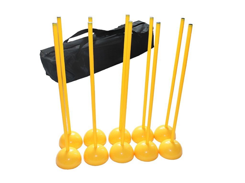 Fotbalový agility tréninkový10x tyče se základnou a taškou je vhodná do tělocvičen. Základna na postavení tyče se naplní vodou nebo pískem. Překážková dráha je variabilní vhodná na kondiční tréninky pro kluby ale skvělá je i do škol. K sadě se dají dokoupit další překážky pro stížení obtížnosti dráhy.