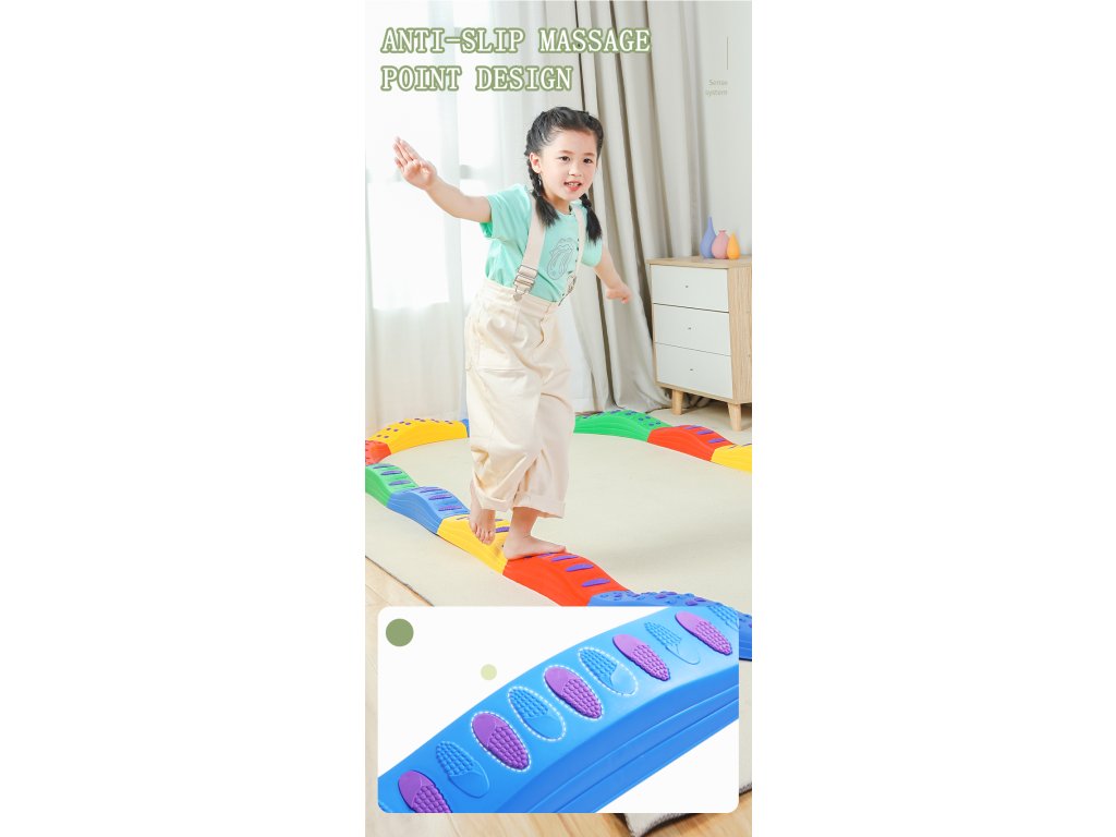 Tato balanční dráha je ideální do mateřských škol, pohybových kroužků, tělocvičen, herních koutků i domácího prostředí. Akupresurní povrch podporuje správné vnímání těžiště, posiluje stabilizační svaly a pomáhá při zdravém psychomotorickém vývoji.