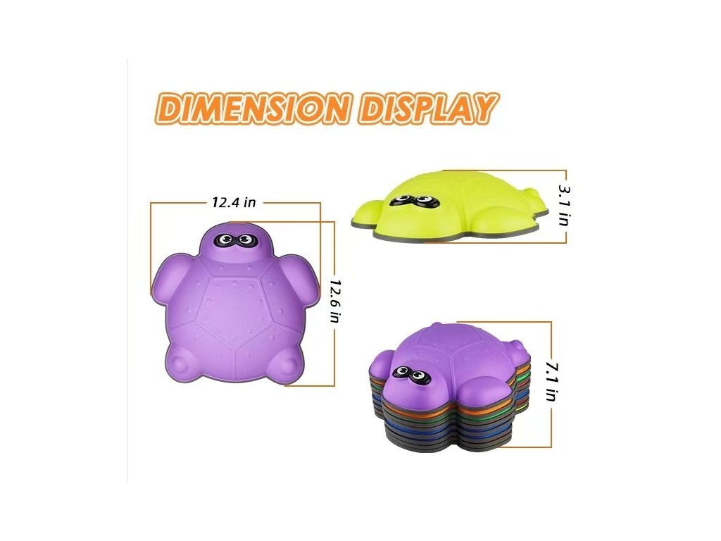 V sadě najdete 6 ks želv v jedné velikosti. Každá želva má rozměr 33 × 32 × 7,5 cm a je vyrobena z pevného, omyvatelného materiálu, který je vhodný pro použití v interiéru i exteriéru. Díky stabilnímu tvaru jsou kameny velmi odolné a poskytují dětem jistotu při každém kroku.