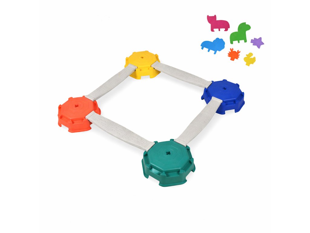 Sada obsahuje 4 stabilní balanční kameny a 4 spojovací dráhy, které společně tvoří bezpečnou a hravou balanční cestu. Do spojovacích dílů lze zapichovat kartičky se zvířátky, které slouží jako překážky nebo zábavné úkoly. Děti si tak při pohybu zároveň hrají, zapojují fantazii a zlepšují kontrolu nad pohybem.