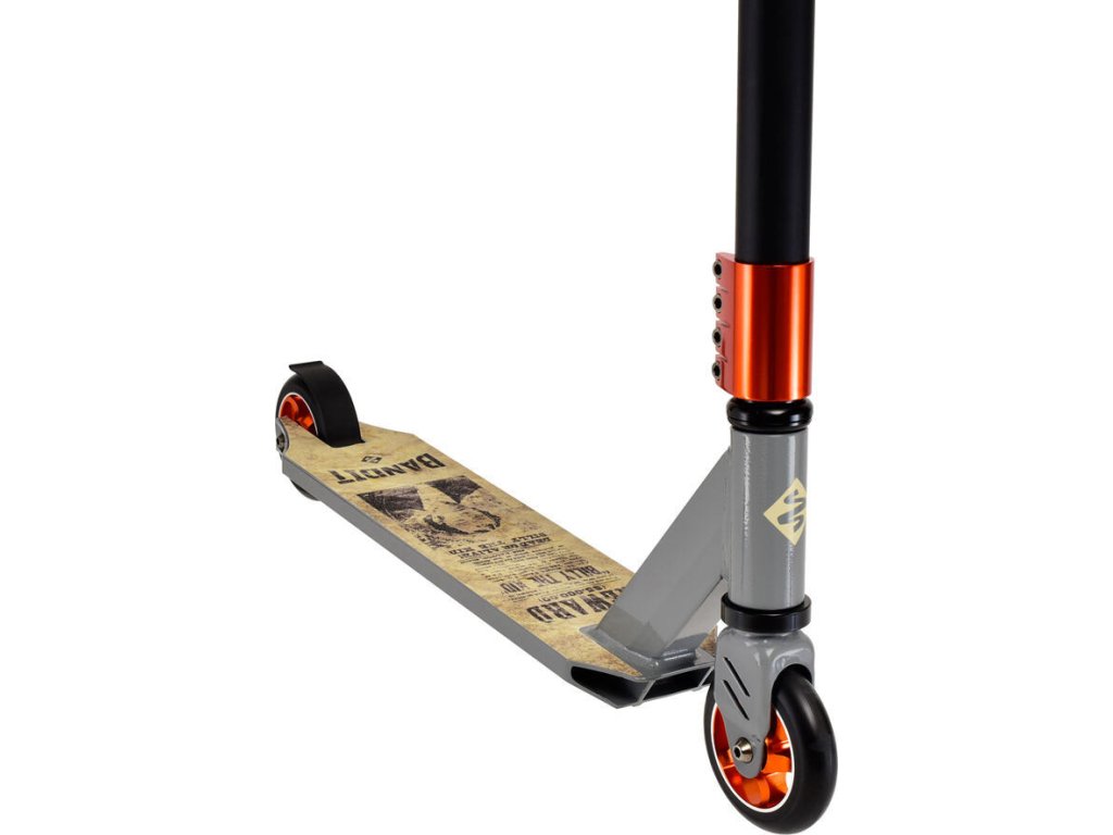 Freestyle koloběžka Bandit značky Street Surfing přichází z nové generace, nabízí vylepšený výkon, široká řídítka 54 cm a rozšířený nášlap 11 cm. Hlavové složení s vysoce kompresní technologií HIC je při skocích a tricích maximálně pevné. Ložiska ABEC 9 pro velmi hladkou jízdu. Řídítka ze slitiny hliníku 6061 vynikají maximální pevností a lehkostí, gripy z trvanlivého a měkkého materiálu - styl ODI, ocelová vidlice, 4-bodová objímka, hlavové složení s technologií HIC, kolečka (100 mm x 24 mm , 88A, PU high rebound) s hliníkovými jádry garantují dostatečnou pevnost při skocích a tricích a výkonná brzda na zadním kolečku. Rozměry koloběžky Bandit jsou (D x Š x V) 66 x 54 x 84 cm, hmotnost 3,4 kg a její maximální nosnost je 100 kg.Doplňkové parametry