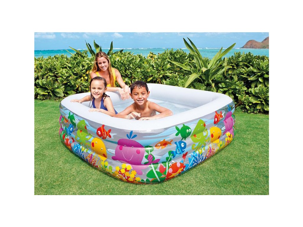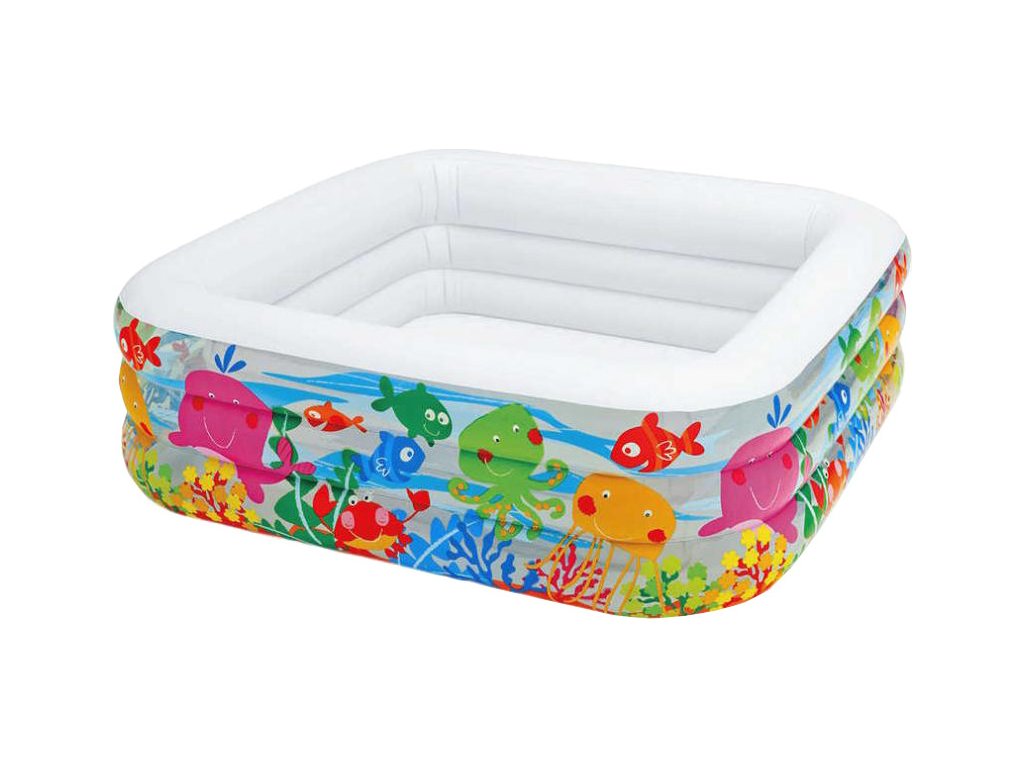 Plavat jako v akváriu umožní Vašim dětem dětský nafukovací bazének Intex Aquarium 57471 s pestrobarevným vzorem mořských živočichů. PVC stěny bazénu s tloušťkou 0,30 mm jsou zesílené proto, aby Vaše děti nevypadly během koupání ven. Instalace bazénu je velice snadná, stačí rozložit bazén na hladkou, vodorovnou a dostatečně stabilní plochu, nafouknout do rozměrů 169 x 169 x 50 cm a napustit vodou. Při 60% napuštění má bazén objem cca 350 litrů. Pumpa sice není součástí balení, avšak v našem e-shopu jí můžete dostat za příznivou cenu. S nafukovacím bazénem dopřejete Vašim dětem příjemné osvěžení během horkých letních dnů v čisté vodě bez nejrůznějších chemikálií.