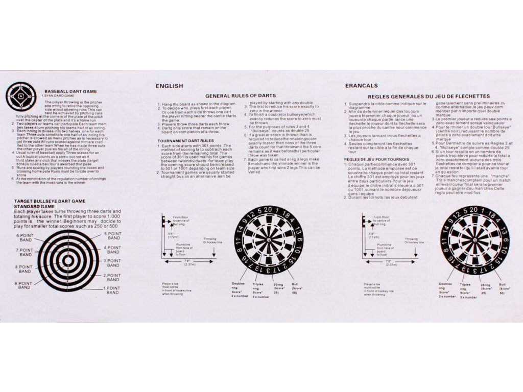 Oboustranný terč na šipky DB 40 je ideální terč pro začátečníky a rekreační hráče. Terč je vyrobený z mnohovrstvého lisovaného papíru s potiskem opatřeným kovovou konstrukcí. Rozměry terče jsou 40 x 1 cm. Na jedné straně je vyobrazený klasický terč s postranními čísly a ocelovými drátky. Druhá strana nabízí zjednodušenou černo-bílou verzi s bodováním od 1 - 9. Balení také obsahuje 6 kusů plastových šipek s ocelovými hroty.