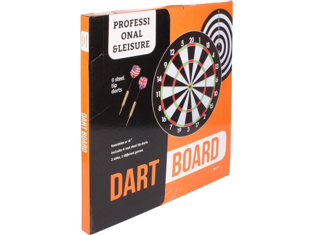 Oboustranný terč na šipky DB 45 je ideální terč pro začátečníky a rekreační hráče. Terč je vyrobený z mnohovrstvého lisovaného papíru s potiskem opatřeným kovovou konstrukcí. Rozměry terče jsou 43 x 2 cm. Na jedné straně je vyobrazený klasický terč s postranními čísly a ocelovými drátky. Druhá strana nabízí zjednodušenou černo-bílou verzi s bodováním od 1 - 9. Balení také obsahuje dvě sady šipek po třech kusech s ocelovými hroty. Soutěžte s kamarády o nejlepšího šipkaře se sadou DB 45.