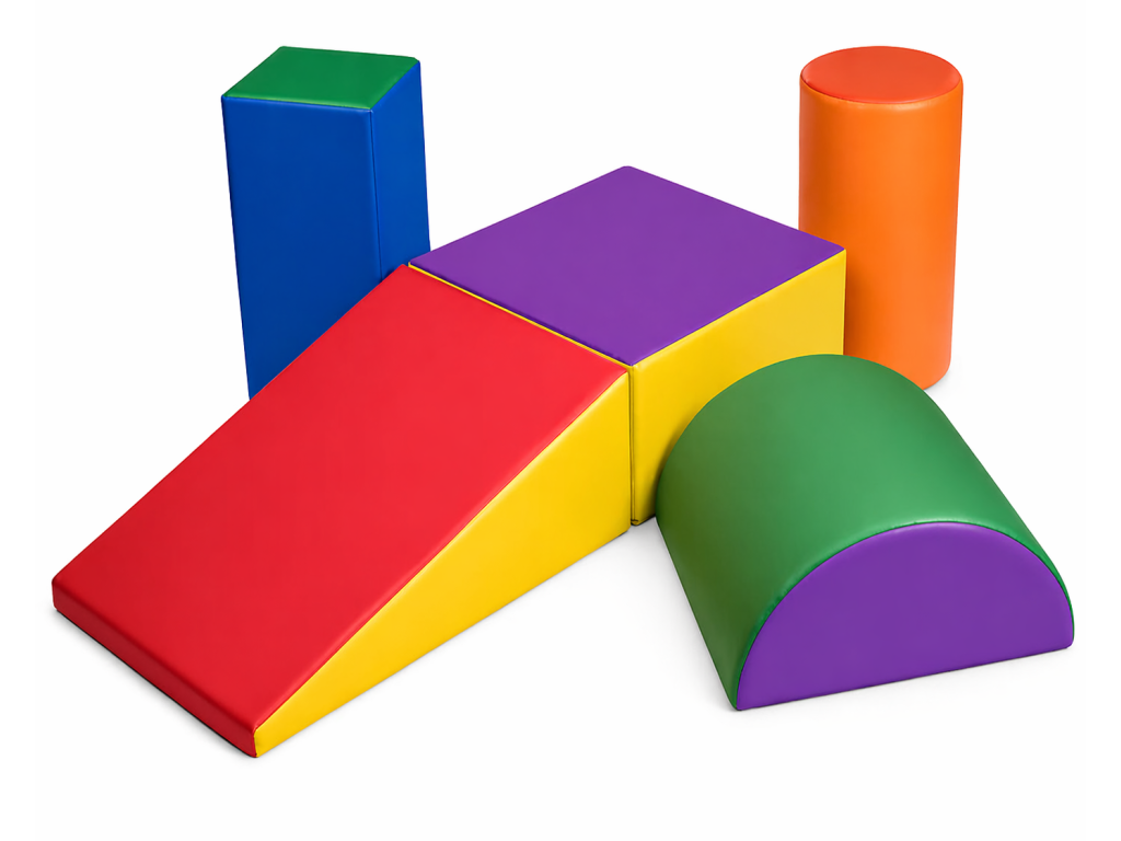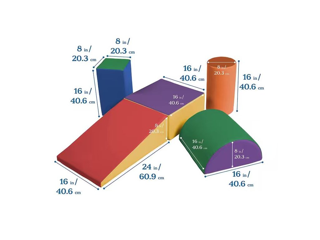 Tato dětská pohybová sada je složena z 5 různých pěnových dílů, které lze libovolně kombinovat a vytvářet překážkové dráhy, rampy, schody nebo balanční sestavy.