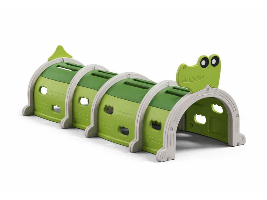 Dětská prolézačka Krokodýl je zábavná pohybová sestava, která děti přirozeně motivuje k aktivitě. Tunelový design umožňuje prolézání, zatímco pevná konstrukce a boční nášlapy nabízejí možnost bezpečného lezení i pohybu po vrchní části sestavy.