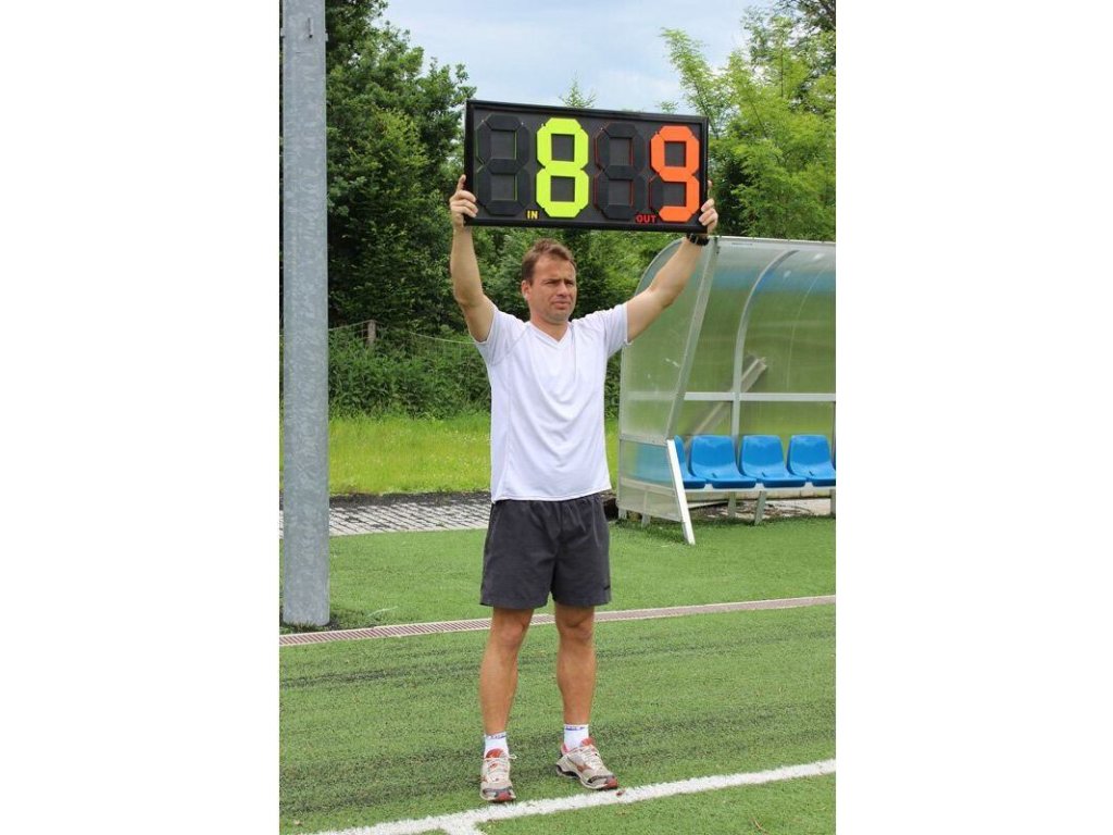 Oboustranná mechanická tabule pro střídání Merco Double je velmi oblíbená mezi trenéry a fotbalovými kluby. Ovládání tabule je velice jednoduché pomocí systému gumiček. Výhodou tohoto modelu je, že z obou stran je možné vidět kdo jde do hry a kdo ven. Číslice jsou velmi dobře viditelné i z větších vzdáleností a to díky světlé žluté a oranžové barvě. Celkové rozměry ukazatele jsou přibližně 84 x 38 x 2 cm.