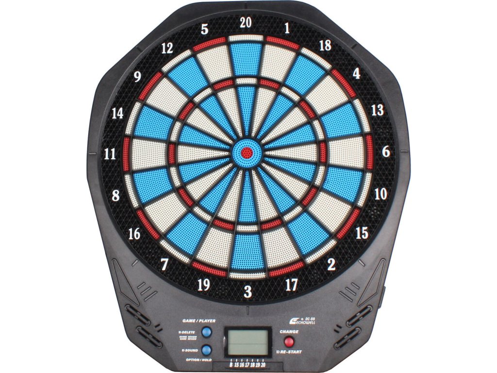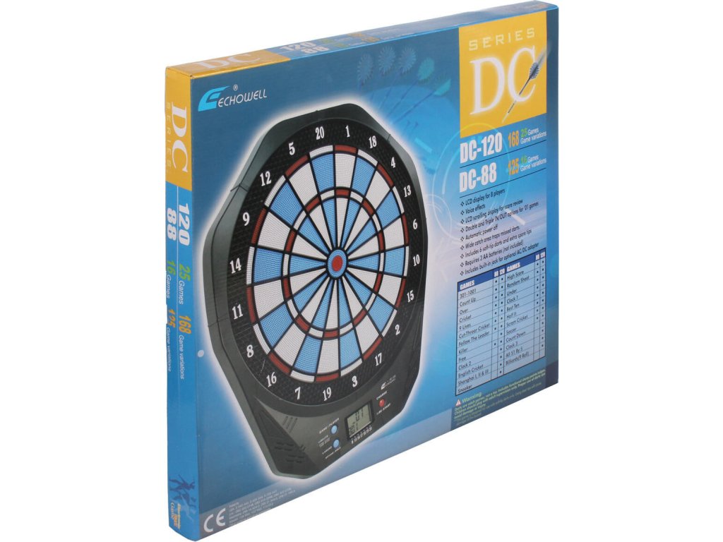 Elektronický terč na šipky Echowell DC 88 je určený pro domácí použití, všechny rekreační hráče a nadšence této zábavné společenské hry. Tento moderní terč DC 88 nabízí 16 her se 125-ti herními variantami. Dále LCD display až pro 8 hráčů, jednoduché ovládání, zvukové efekty, automatické vypnutí po delší době nečinnosti. Součástí balení je i 6 šipek s plastovými hroty a sada náhradních hrotů. Celkové rozměry terče jsou (V x Š x H) 52 x 45 x 3,5 cm, hmotnost terče je necelých 1,95 kg. Terč můžete napájet buď pomocí 3x AA baterií nebo AC/DC adaptérem pomocí vestavěného konektoru.Upozornění: baterie ani adaptér nejsou součástí balení.Parametry produktu