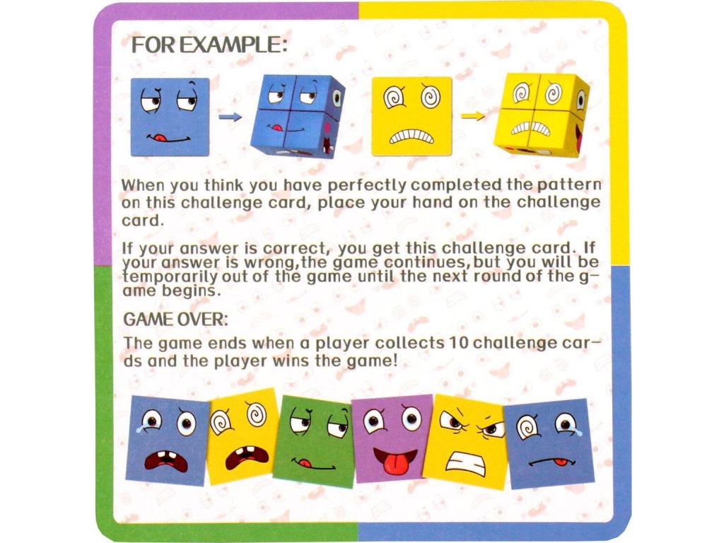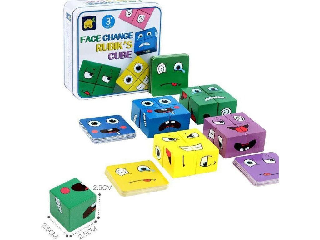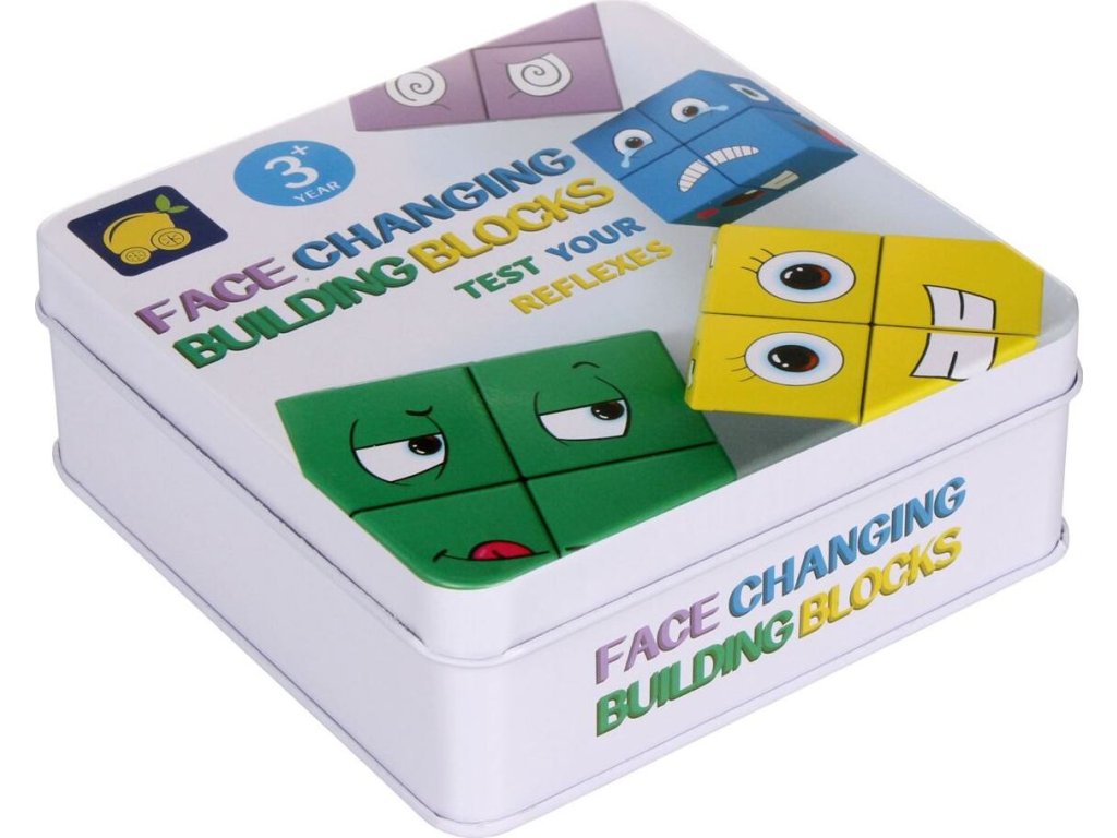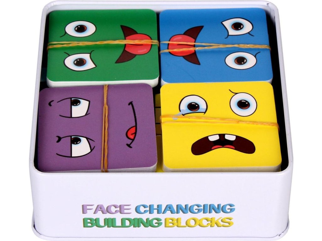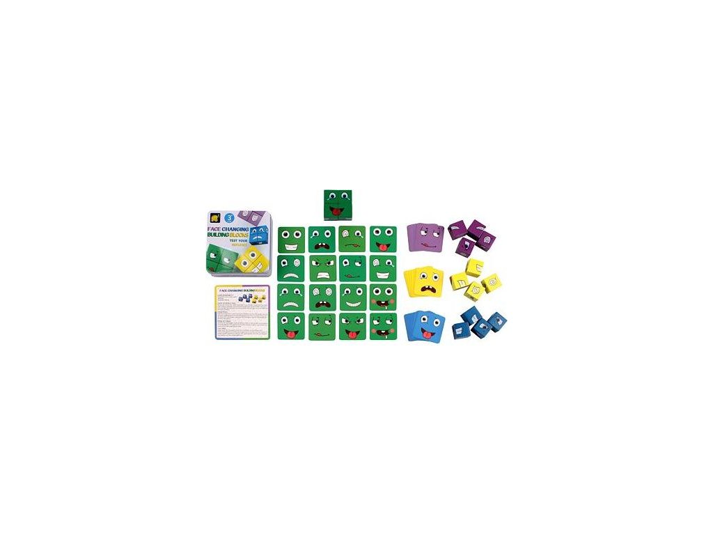 Kreativní stolní hra Face Change s barevnými kostkami, ze kterých se staví obličeje. Hra napomáhá rozvíjení postřehu, představivosti a usnadňuje dětem vyjádřit jejich pocity. Také učí děti ke skupinové hře. Hra je vhodná domů, na kroužky, tábory nebo dětské akce. Hra je určena pro 1-4 hráče ve věku od 3 let. Obsah hry: 16 kostiček (4 ks ve 4 barevných variantách), 64 kartiček s obličeji (16 ks ve 4 barevných variantách), zvoneček. Jak se hra hraje? Cíl hry: Slož ze svých 4 kostiček obličej, který je právě na otočené kartičce, co nejrychleji dokážeš. První, kdo vytvoří odpovídající obličej, získá kartičku s obličejem. A ten, kdo bude mít jako první 10 nasbíraných kartiček, vyhrál. Začátek hry: Zamíchej všechny obličejové kartičky na stole obličeji směrem dolů. Každý hráč si vybere jednu ze 4 barev a od té barvy si vezme 4 kostičky s částmi obličejů. Hra: Začíná nejmladší hráč a ten otočí jednu obličejovou kartičku. Každý hráč se snaží co nejrychleji sestavit ze svých kostiček obličej, který je na kartičce. První, kdo si myslí, že má hotovo, zacinká na zvonek. Pokud je jeho obličej opravdu správně složený, získává kartičku obličeje. Ovšem pokud je obličej složený špatně, kartička se zamíchá znovu do hromádky kartiček a hraje se dál. Hráč, který měl obličej složený špatně se už nesmí toto kolo znovu zapojit, musí počkat až do dalšího kola. (Jedno kolo je, dokud se v otočení kartičky nevystřídají všichni hráči – max. tedy 4 otočení kartiček na jedno kolo.) Konec hry: Hra končí, když jeden hráč jako první nasbírá 10 obličejových kartiček. Ten se stane vítězem. Parametry materiál: dřevo, papír rozměr kostky: 2,5 x 2,5 cm rozměr kartičky: 5 x 5 cm kovová krabička: 11 x 11 x 4,5 cmDoplňkové parametry
