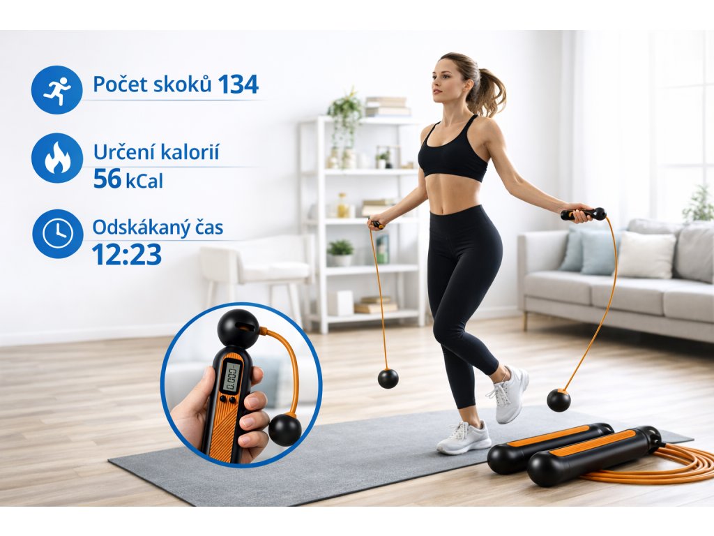 Fitness švihadlo s digitálním displejem je praktická pomůcka pro domácí i kondiční trénink. Umožňuje sledovat počet přeskoků, odhad spálených kalorií i délku tréninku. Díky možnosti použití bez lanka je ideální i do menších prostor.