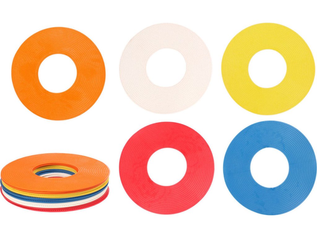 Značka na podlahu Merco Flat Ring je praktická cvičební pomůcka, díky které vytvoříte během chvilky tréninkovou dráhu dle svých představ. Tato sada se skládá z dvaceti kruhů vyrobených z elastické termoplastické gumy (TPR), s vnějším průměrem 19 cm, vnitřním průměrem 8 cm a hmotnost jednoho kruhu je přibližně 60 g. Díky použitému materiálu jsou značky vhodné pro venkovní tréninky i do tělocvičen. Sada je zabalena v praktické polyesterové síťce se stahováním na šňůrku. - sada: 20 značek - materiál: TPR - vnější průměr: 19 cm - vnitřní průměr: 8 cm - výška: 2 mm - hmotnost značky: cca 60 g - hmotnost sady: cca 1,2 kg - dodávané v praktické síťceDoplňkové parametry