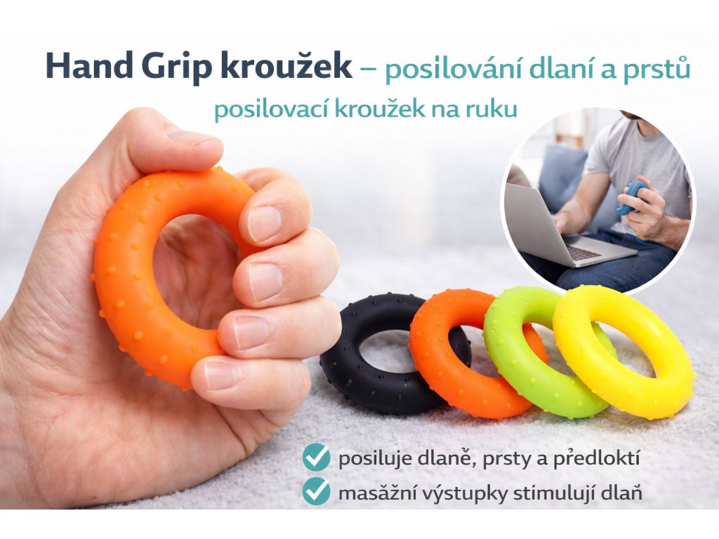 Masážní posilovací kroužek je jednoduchá, ale velmi účinná pomůcka pro posilování rukou. Pomáhá zlepšovat sílu stisku, posiluje svaly dlaní, prstů i předloktí a zároveň díky výstupkům jemně masíruje dlaň během cvičení.
