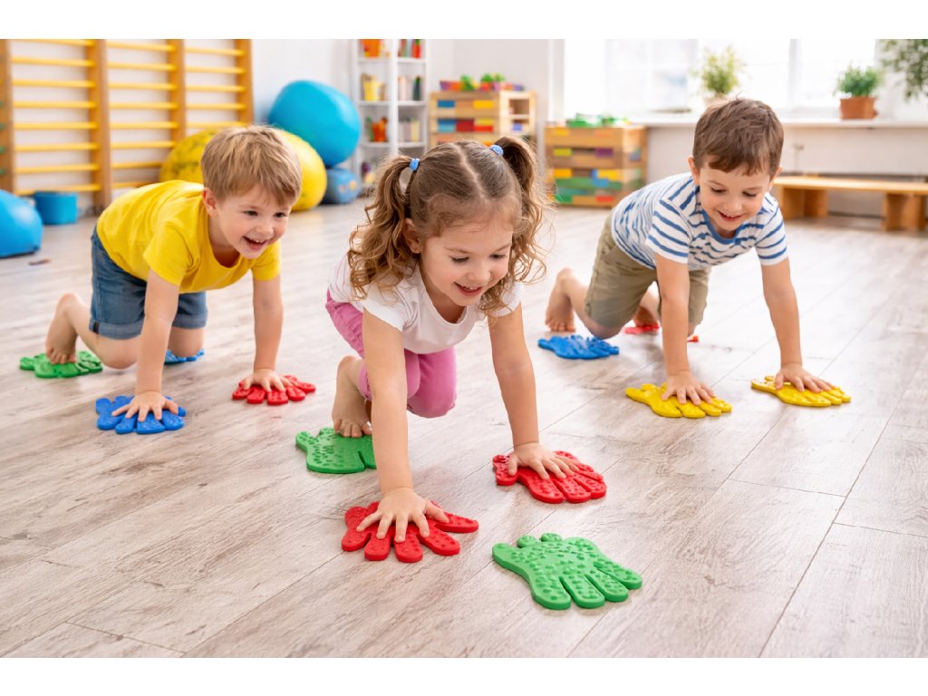 Hmatová akupresurní sada je zábavná a zároveň funkční pomůcka pro rozvoj dětské motoriky, rovnováhy a smyslového vnímání. Díky výrazným barvám a strukturovanému povrchu děti přirozeně zapojují hmat, stimulují chodidla i dlaně a rozvíjejí koordinaci pohybů.