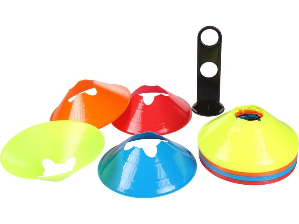 Vytyčovací víceúčelové mety Jumbo s průměrem 19,5 cm a výškou 5 cm jsou vyrobené z měkčeného plastu a jsou tak odolné proti prošlápnutí nebo jiné deformaci. Díky různým barvám lze z met vytvořit pestrou a nápaditou dráhu. Do výřezů na vrcholu lze vložit tyčky s průměrem 25 mm a postavit tak na dráze i překážky. Sada obsahuje 32 met rovnoměrně rozdělených do 4 barev a plastový stojánek pro jejich snadné přenášení.