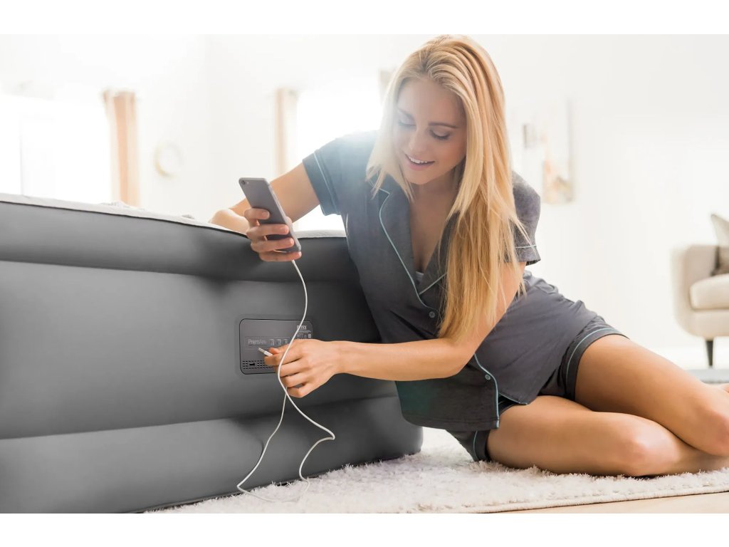 Vysoce kvalitní nafukovací postel z modelové řady PREMAIRE. Postel má zabudovanou speciální elektronickou pumpou na 220-240 V, kterou lze ovládat manuálně nebo přes bluetooth pomocí chytrých telefonů/tabletů, atd. Postel takto velice rychle a snadno nafoukne již v čase cca 4 minut.
