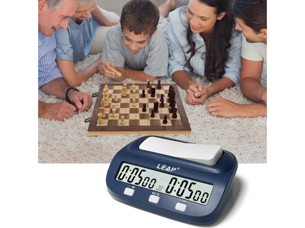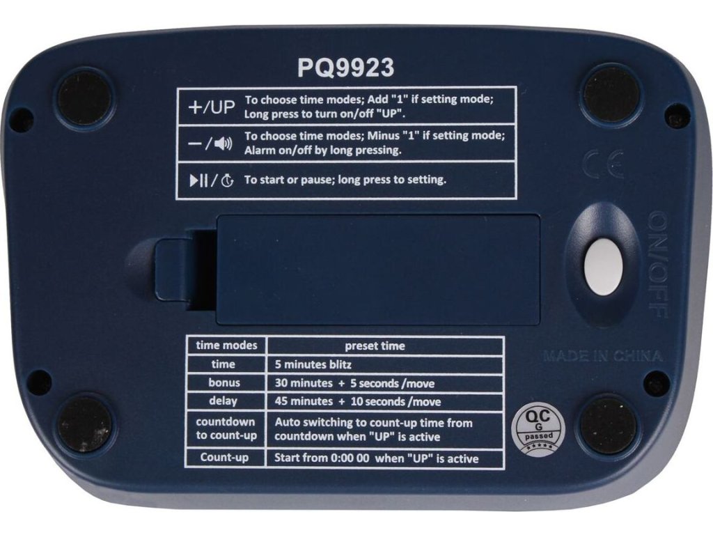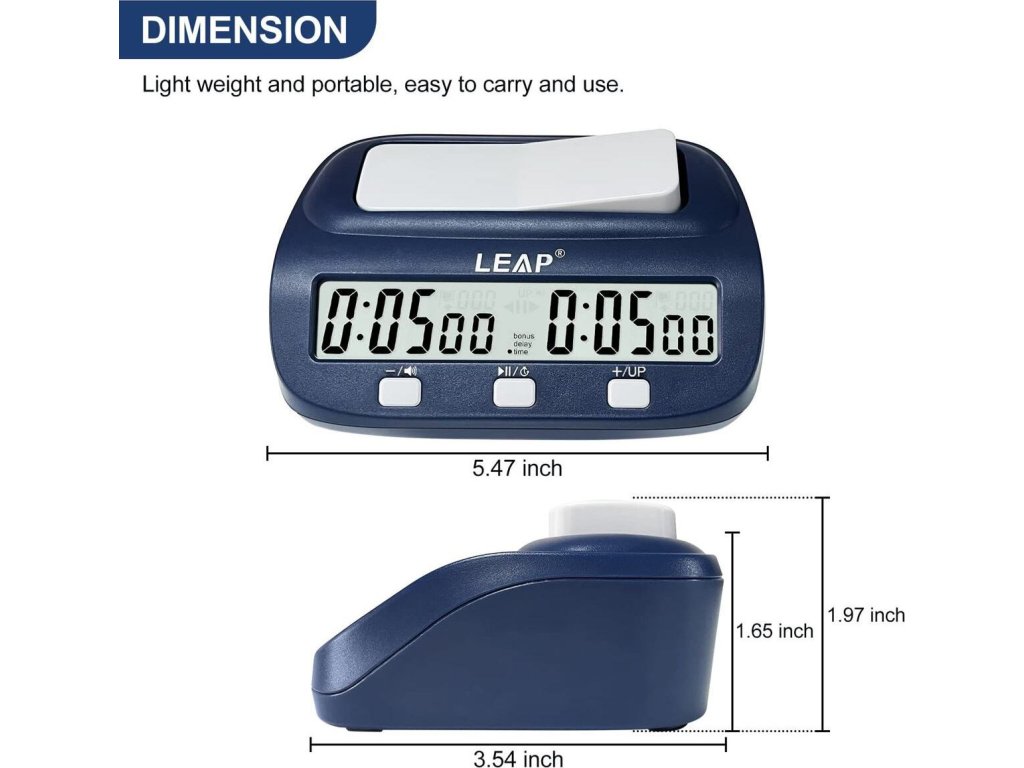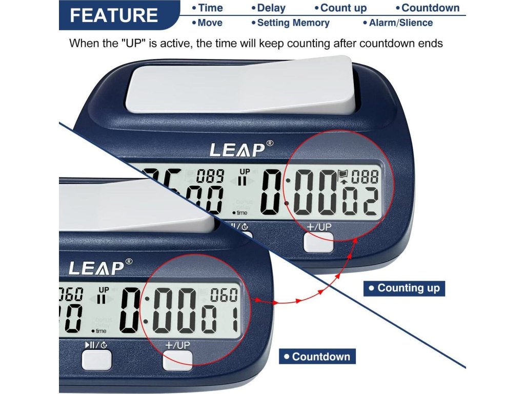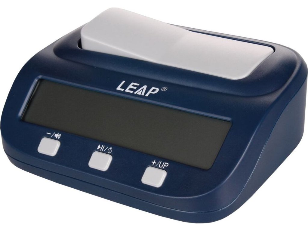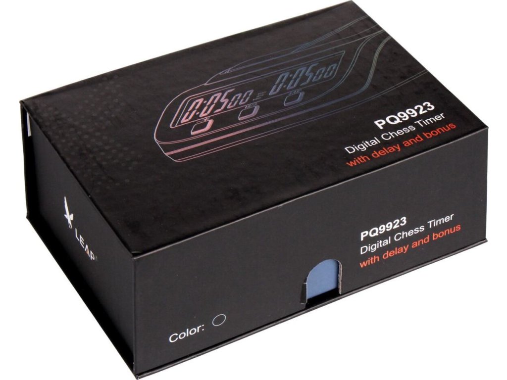 Digitální šachové hodiny LEAP PQ9923 využijí při hře jak nadšení amatérští šachisté, tak začínající aktivní hráči při tréninku v šachových oddílech nebo ve školách. Hodiny vyrobené z odolného plastu se snadno ovládají a jejich nastavení je jednoduché a intuitivní. Přes svou malou velikost nabízejí dostatečně velký a přehledný LCD displej. Napájeny jsou jednou baterií AA. Funkce - Podpora odpočítávání nahoru, odpočítávání dolů, bonus/přírůstek a zpoždění. - Automatické přepnutí na odpočítávání, když vyprší čas odpočítávání. Tuto funkci lze zapnout/vypnout před začátkem času, pokud není potřeba. - Časovač odpočítávání maximálně 10 hodin. - Vytvoření a uložení vlastního režimu časování pro každého hráče, snadná změna času během hry. - Při opětovném zapnutí časovače po jeho vypnutí se automaticky objeví naposledy použitý režim časování. - Zvukový alarm lze zapnout nebo vypnout. - Velký displej LCD. - Napájení 1ks baterie AA (není součástí balení). - Rozměry, šířka x výška x hloubka: 14 x 3,5 x 9 cm.Doplňkové parametry