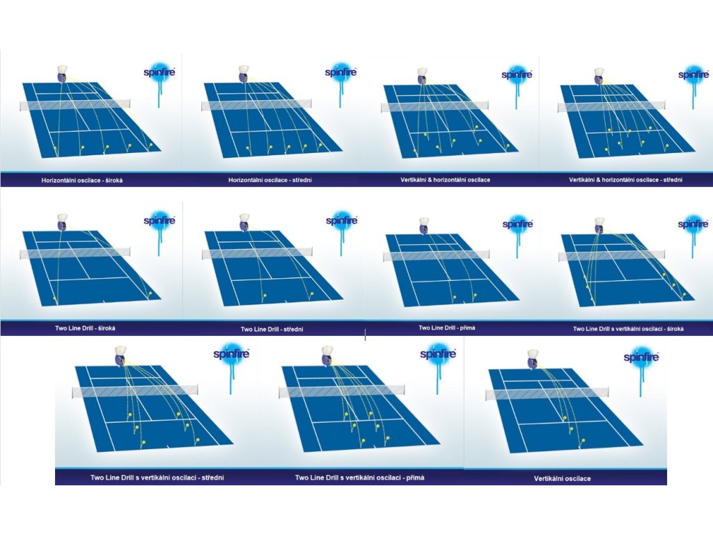 Two Line Drill: Spinfire Pro 2 nabízí jak zcela náhodný směr nahrávky, tak i užitečnou funkci Two line drill. Jakmile nastavíte tuto funkci, míčky již nebudou létat náhodně, místo toho stroj bude nahrávat střídavě na forehandy a backhandy. Tato funkce může být dále nastavená na tři úrovně dle zkušenosti hráče (přímá, střední, široká). Můžete také nastavit časování mezi jednotlivými nahrávkami. Pro extra obtížnost můžete zároveň nastavit vertikální oscilaci pro různé výšky nahrávky.
