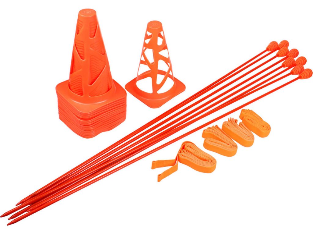 Se sadou Merco Quick Agility Set si vytvoříte během chvilky tréninkovou dráhu či vymezíte prostor dle svých představ. Tento set obsahuje šestnáct kuželů s otvory, osm sklolaminátových tyčí a čtyři elastické popruhy. Kužely jsou vyrobené z měkkého PVC materiálu, nehrozí tedy jejich mechanické poškození i při hrubším zacházení. Tyče jsou zakončené plastovou koncovkou o celkovém průměru 3 cm. Popruhy mají délku přibližně 280 cm a šířku 2 cm. Celá sada je zabalená v praktickém polyesterovém vaku s upínací šňůrkou. - sada: 16x kužel + 8x tyč + 4x elastický popruh - materiál: PVC, sklolaminát, nylon - výška kuželu: 23 cm - základna kuželu: 15 x 15 cm - délka tyče: 103 cm - popruh: 280 x 2 cm (délka x šířka) - rozměry balení: 105 x 28 x 18 cm - hmotnost balení: cca 2,2 kgDoplňkové parametry