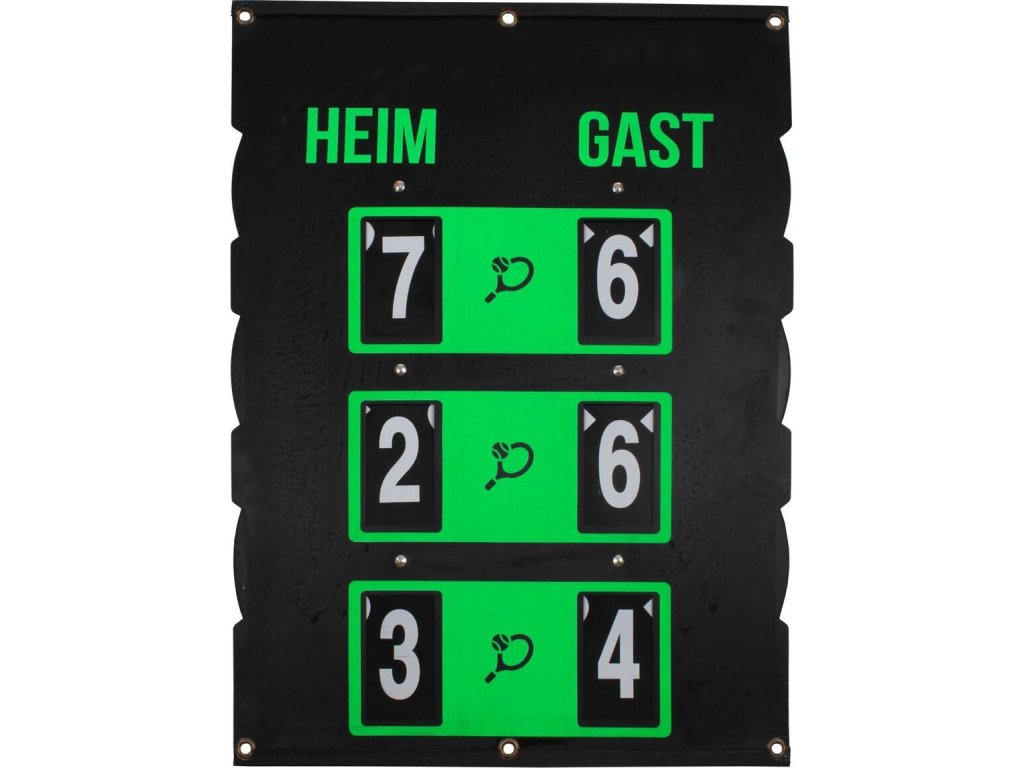 Díky oboustrannému ukazateli skóre Merco Scoreboard DE budete spolehlivě zaznamenávat průběh každého tenisového duelu. Tří-setový ukazatel skóre s rozpětím bodů 0 – 7 má 9 cm velké bílé číslice na kontrastním černém podkladu a neonově zeleném pozadí, aby bylo skóre dobře viditelné pro hráče i pro diváky. Pohyb číslic zajišťují manuálně posuvná kola po stranách ukazatele. Celkové rozměry ukazatele vyrobeného z odolného ABS plastu jsou 83 x 58 cm a na svém horním i dolním pogumovaném okraji je doplněný otvory pro zavěšení. Vzhledem k použitému materiálu má Scoreboard nízkou hmotnost 3,4 kg. Tento model je vyrobený s německými nápisy. - materiál: ABS plast, guma - rozměry: 83 x 58 cm - hmotnost: 3,4 kg - jednoduché používání - kovová oka pro zavěšení - DE nápisyDoplňkové parametry