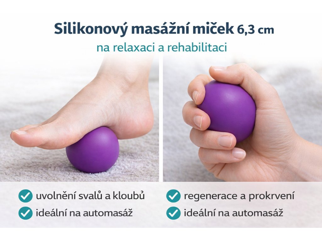 Silikonový masážní míček o průměru 6,3 cm je univerzální pomůcka pro každodenní regeneraci, relaxaci i rehabilitaci. Pomáhá uvolňovat ztuhlé svaly, podporuje prokrvení a je vhodný jak po sportovní zátěži, tak po dlouhém sezení nebo práci.
